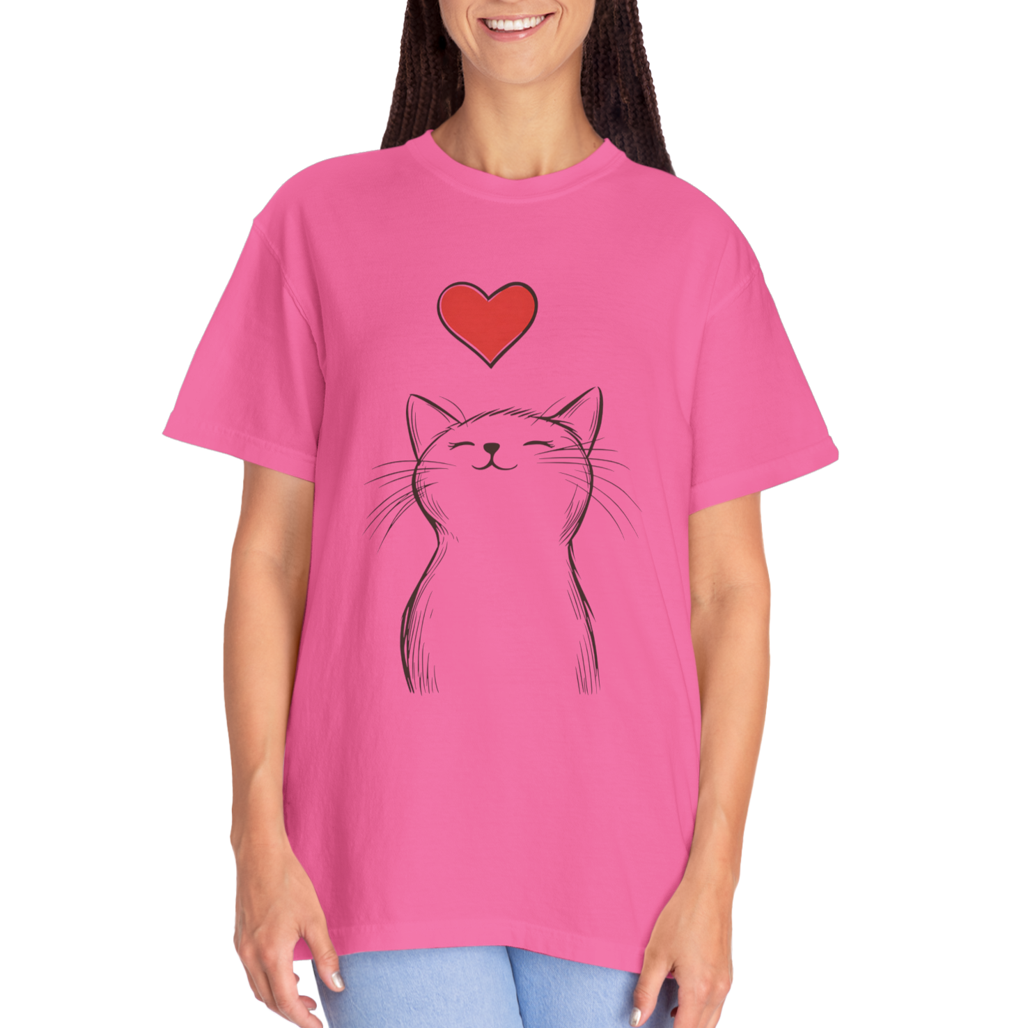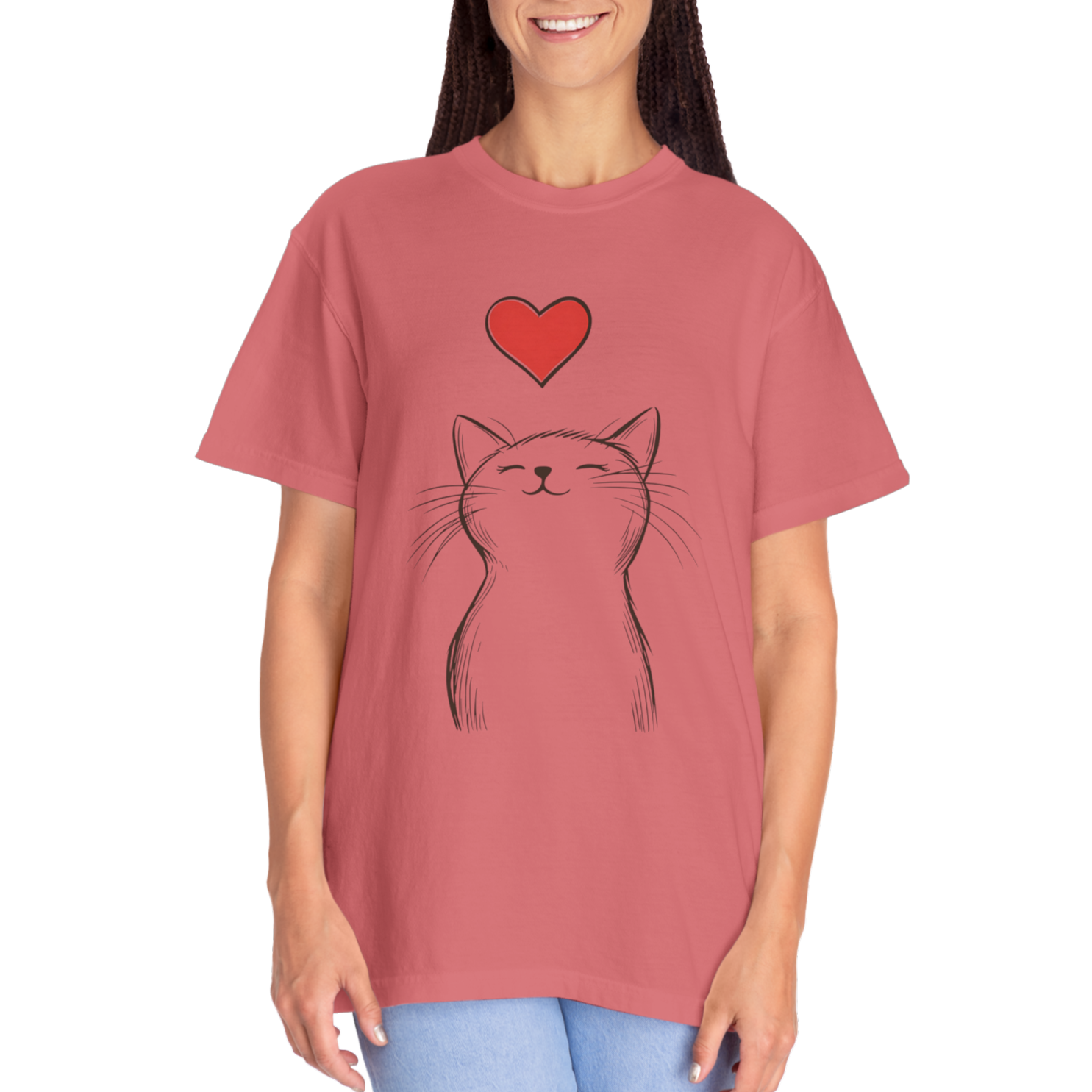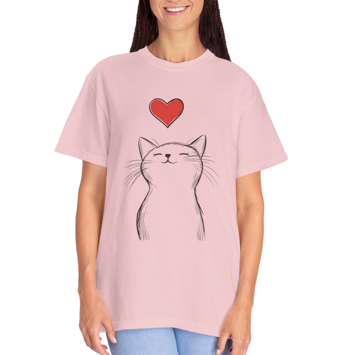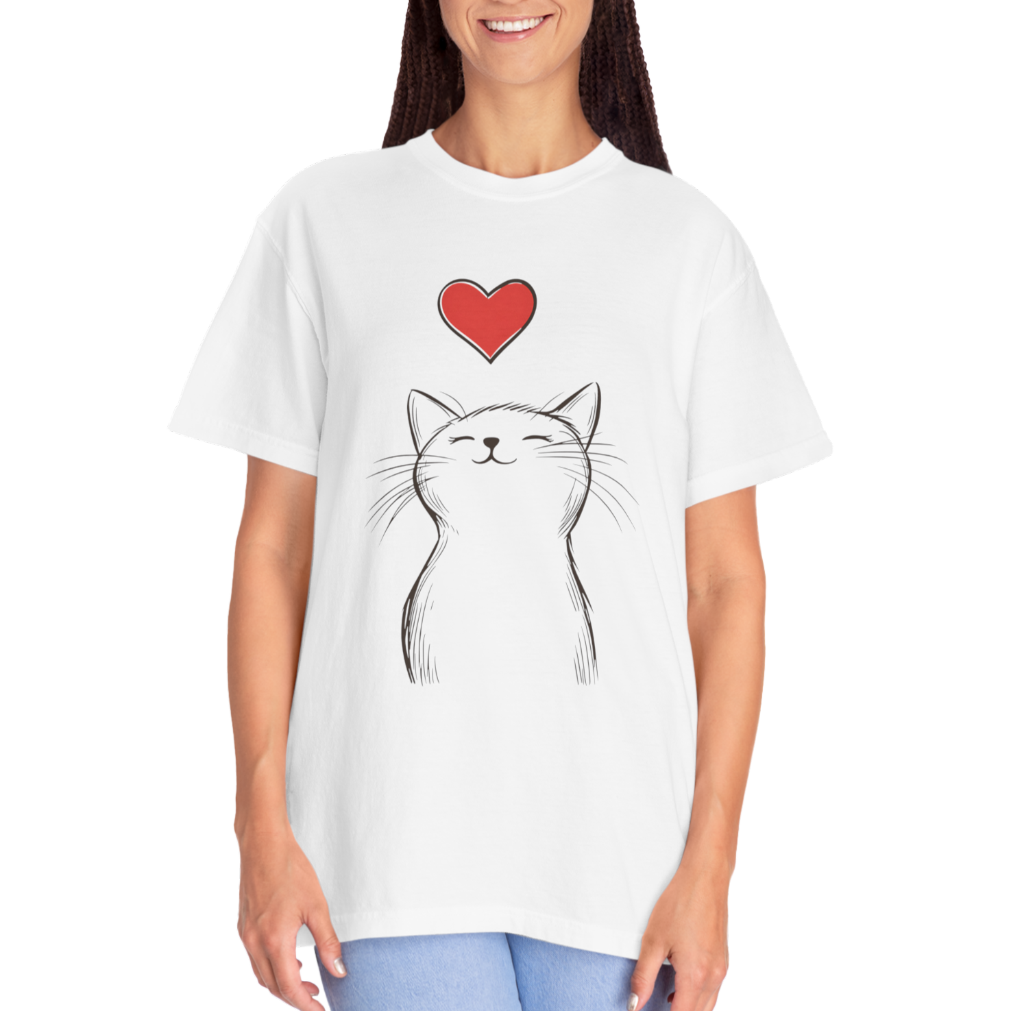The garment-dyed process gives each shirt a unique vintage look, while the adorable cat design adds warmth and personality. A cozy, high-quality piece for anyone who believes that love (and a cat) makes everything better.