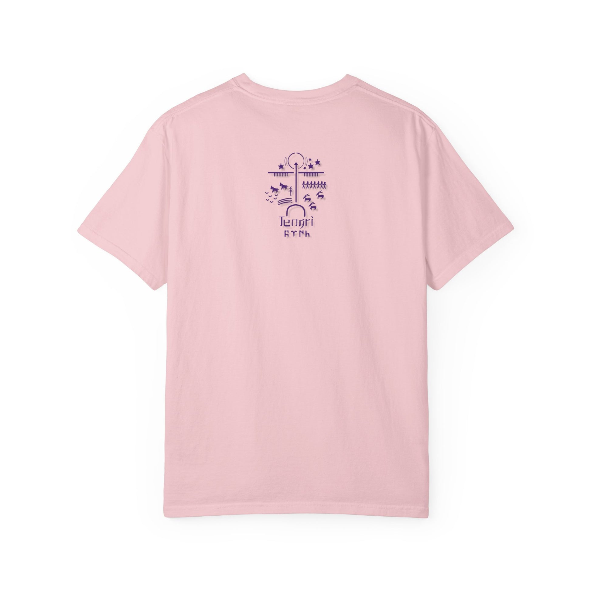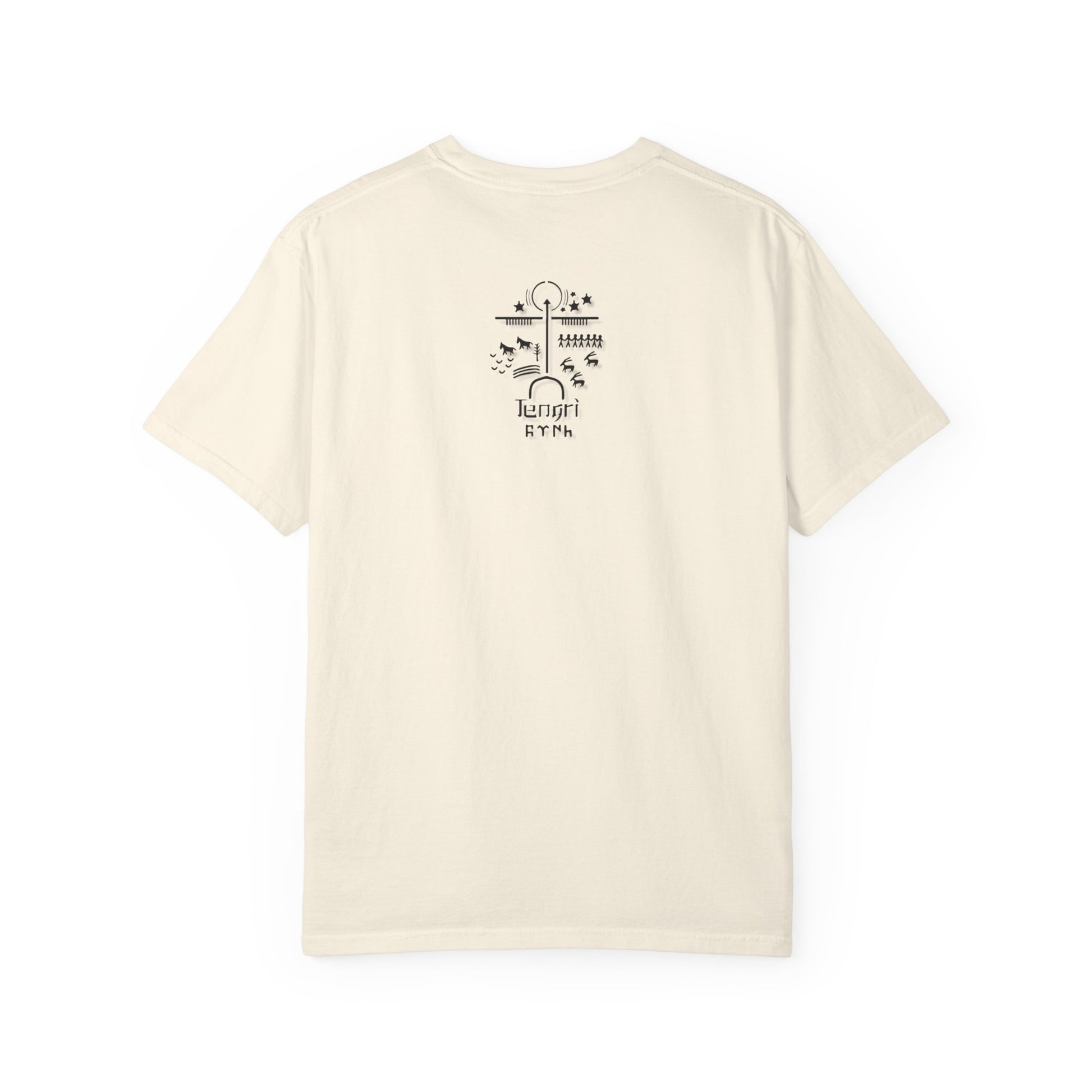 This unisex garment-dyed T-shirt features the ancient Tengri symbol, representing the sky deity of Central Asian and Turkic cultures. The design reflects harmony between the heavens, earth, and humanity — a minimalist tribute to timeless spiritual and cultural heritage.
